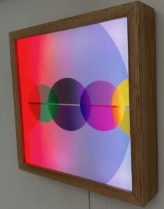 In these recent paintings and light works Caroline List explores formal compositions through colour contrast and light. The surface and colour within her work sets up a spatial language, a visual tension between flatness, illusory space and chromatic value. These mixed media works play with the simulation of space within painting, creating a dialogue between the ….. original painting and its virtual reproduction. This is particularly relevant in a time when the viewer’s experience of ‘Art’ is often seen through the interface of the screen.